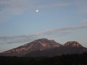 The day started fairly still, Polly (the collie) and I drove up from Mont-roig to Colldejous, the massiv of the Mola looming behind the town and under what was left of a full moon in the early morning light. We snaked through the village and took the trail up and around the east side of the thickly forested slopes towards the pass at the head of the valley. Across the divide we could hear the steady drone of the wind-generator farm serried along the ridges of La Parrica and friends.