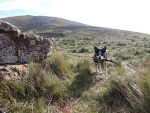 We gained the summit plateau and headed for the shelter of the Castello, an abandoned stone construction of an inner room with an outer protective ring of stone and ditch. The now icy wind whistled through and around the stones, making stopping for a chat with the men and their dog a brief affair. They were of course all Catalans, but we conversed in Castellano or Spanish, as is often the custom here. A short stop and then Polly and I left for warmer climes, the wind buffeting us across the plateau until we reached the relative shelter of some rocks next to a pond atop the plateau. Here we could stop for a more relaxed drink of water and an energy bar while soaking up the view. Looking around, not a tree was to be seen, however, Polly did, naturally, manage to find a stick to have thrown for her.