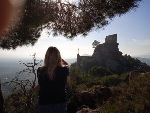 The route steadily gains height as we pass workers pruning the olive trees, and throw the occasional stick to keep Polly occupied. The weather was fine for January and some light cloud drifted lazily across the blue sky. As we approached the base of the main part of the ascent, huge cactuses started to peer out from the corners of the olive groves. The Hermita almost appeared to be built on fields of cactus. The last part of the trail became paved with rocks and the views opened out on the surrounding countryside as we gained height. We could see the sunlight glinting of the mediterranean coast below us through the morning haze.