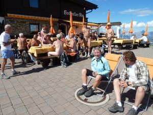 We needed no further encouragement and our flimsy wraps and shorts came off, much to the surprise of one other couple, who’d I’d neglected to ask. They however were quite ok with us being naked too, furthermore they were happy to be video interviewed by the naked Gilles as to how they felt about more than 20 plus naked guests sharing their alpine coffee break with them. They seemed pretty comfortable about it all, the lady even removing her jumper to show some solidarity, (or perhaps she was just getting a bit hot).