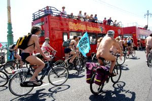 These images all show the way in which the WNBR enhances itself as an environmental protest, bringing the participants and the public together in a very special clothed and naked chiaroscuro. Many images from the WNBR are truly excellent and belong in the photo-documentary slot of any comprehensive photographic library purporting to be representative of modern times, and we present a frustratingly space-determined selection of these images, from the many hundreds submitted, for your curiosity here. The entertainment value is greatly enhanced when the locations also cry out for recognition. For instance, the London route wends it’s naked way through such famous landmarks as Piccadilly Circus, Trafalgar Square, The Mall, Whitehall, Westminster, Waterloo, Fleet Street, The Royal Courts of Justice, Wellington Arch, St Paul’s Cathedral, London Bridge, Tower Bridge and the Tower of London; all with the happy accompaniment of cheering crowds.