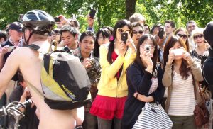 Voyeurism is the same charge leveled at the media when they click frantically, capturing all the bare naked flesh on show at a typical WNBR, only to have publication in their newspapers denied because of the editors who fear their advertisers and their readership, or their paymaster. What man doesn’t want to gawk at the naked ladies? What woman doesn’t want to peer sideways at the naked men, and pretend she’s not looking? Of course any public naked event can be seen as a gay boys’ paradise, as there is usually a predominance of naked men than naked women, although in London particularly the numbers are more balanced. But is this important?